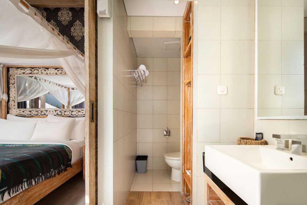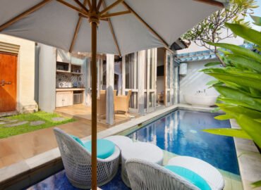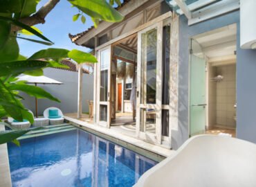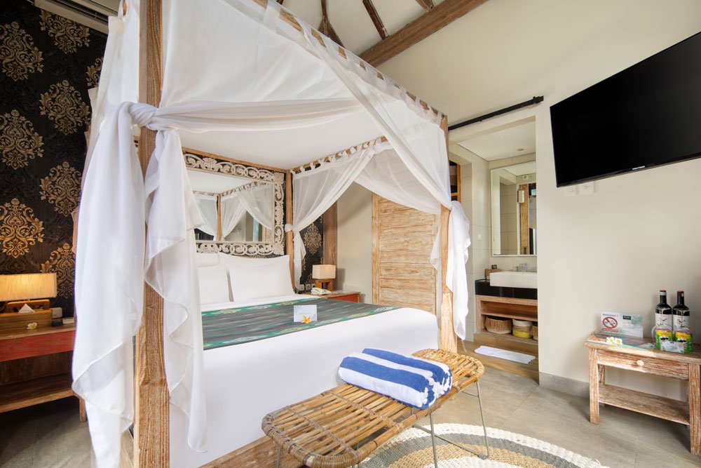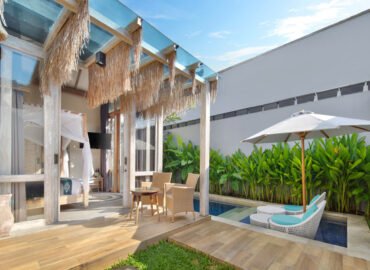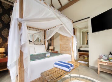 Experience unparalleled comfort and privacy in our 62 m² Star Villa, featuring a super king bed and a spacious living area. Enjoy your exclusive private pool with an integrated hot tub, and relax on your private patio or terrace overlooking the pool. The villa showcases contemporary Indonesian decor, characterized by elegant four-poster beds, rich wooden accents, unique patterned textiles, and serene outdoor spaces, creating a tranquil and luxurious escape.