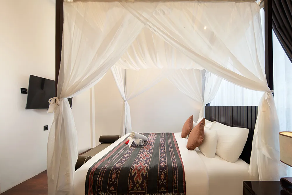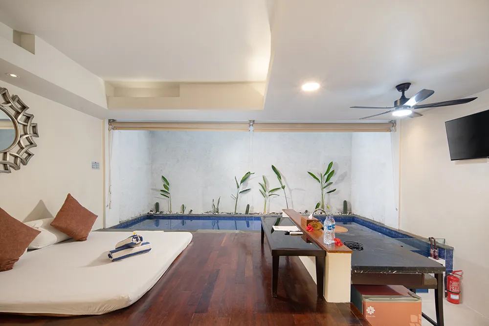 Experience unparalleled comfort and privacy in our 80 m² Two-Bedroom Suite Loft, featuring a spacious living area with a sofa bed, a private kitchen, and two separate bedrooms. Enjoy your exclusive private pool and hot tub, and a private balcony overlooking the pool. The modern Balinese decor, warm wooden accents, and lush surrounding greenery create a tranquil and luxurious escape.